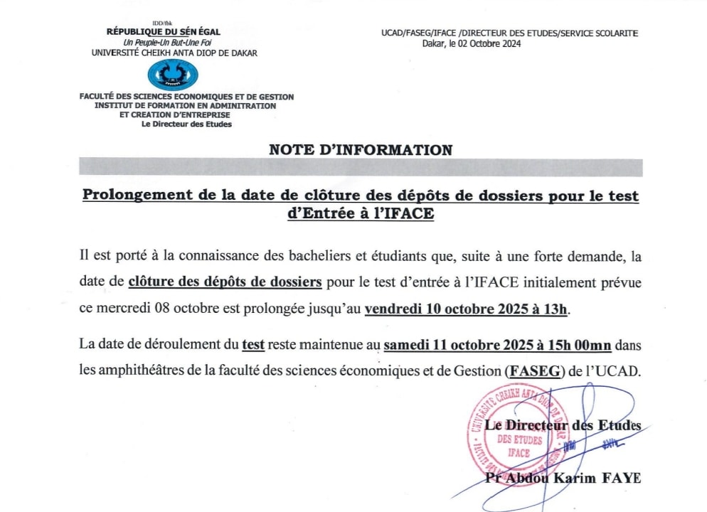 L’Institut de Formation en Administration et en Création d’Entreprise (IFACE) informe les bacheliers, étudiants et professionnels que, suite à une forte demande, la date de clôture des dépôts de dossiers pour le test d’entrée à l’IFACE initialement prévue le mercredi 08 octobre 2025 est prolongée jusqu’au vendredi 10 octobre 2025 à 13h.